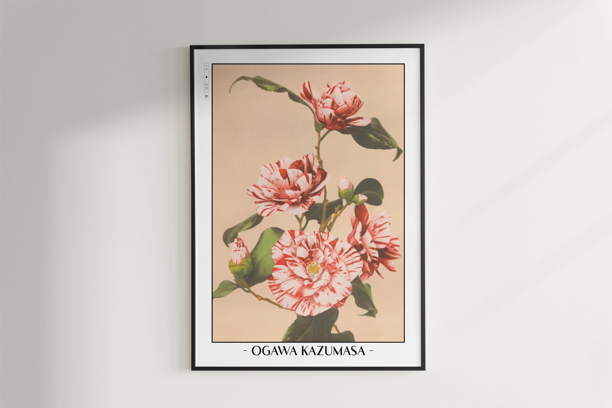 Striking striped camellias enrich this Ogawa Kazumasa art print, blending bold colour markings with refined botanical structure for a captivating flower print.