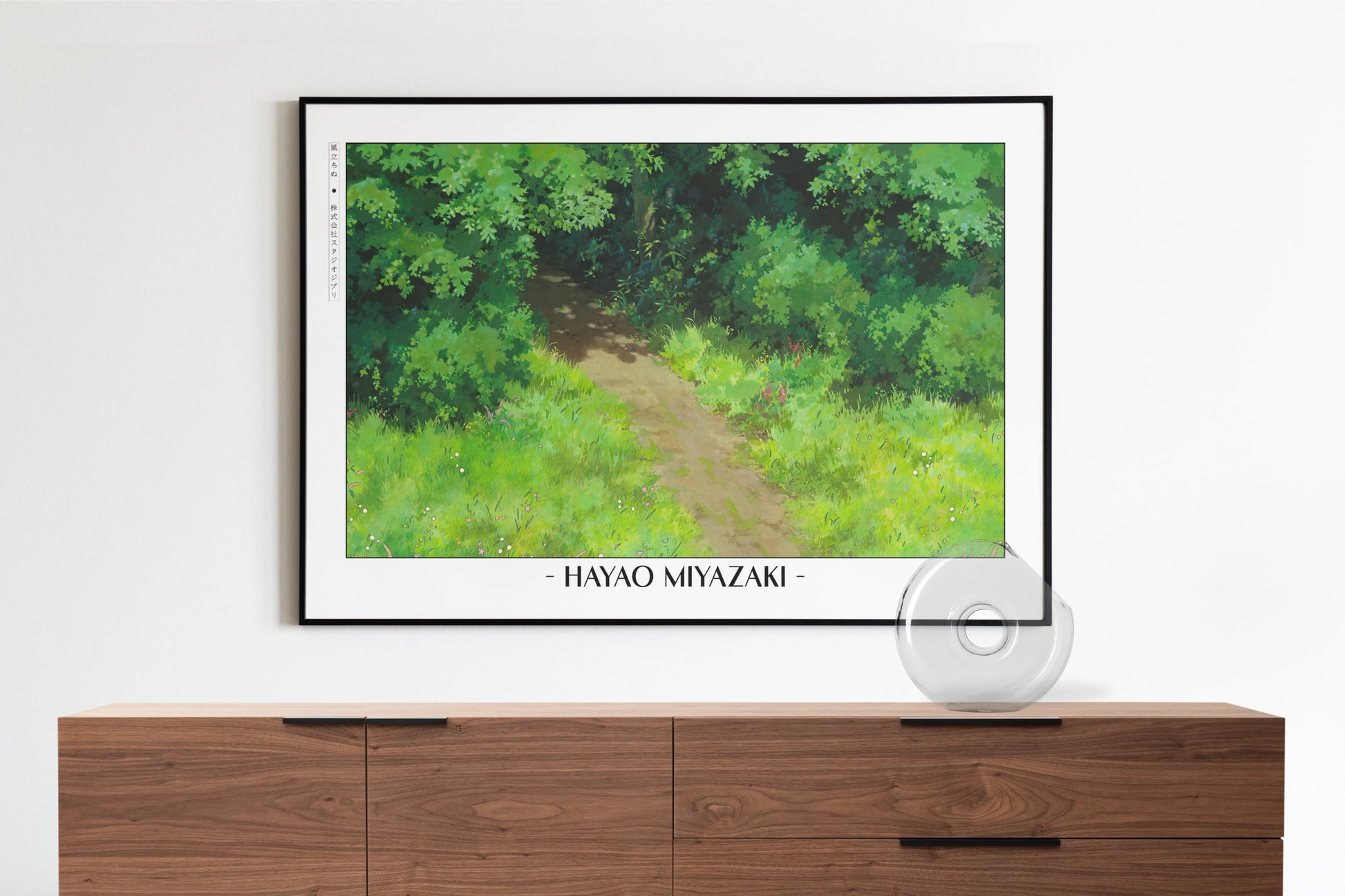 This Studio Ghibli artwork draws the eye down a forest path hidden in green light - mystery wrapped in calm. A lush anime poster filled with atmosphere and curiosity.